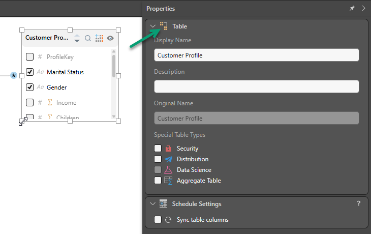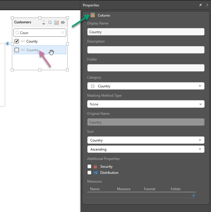 Select a column (purple arrow below) to show its properties in the Properties panel (green arrow).