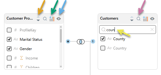 Click Search to filter the table to show only those Columns whose names match with your search term. Clicking the Search button opens the Search text field (yellow arrow), where you can type the value that you want to search on. Close the search field (X) to clear your search and show all Columns again.