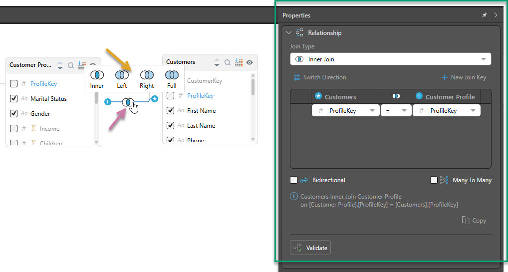 Click the existing join (purple arrow below) to open both the join type context menu (orange arrow) and the Properties panel (green box). You can change the Join Type from either location and change the Join's properties as needed, updating its columns, deleting it, switching its direction, validating it, and so on.