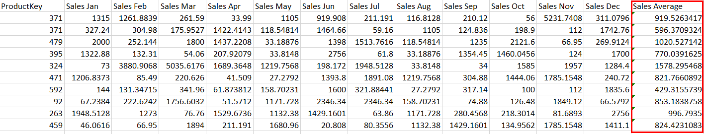 To do this, we aggregate all the Sales columns by the Average function, producing a new column which shows the average value for each row: