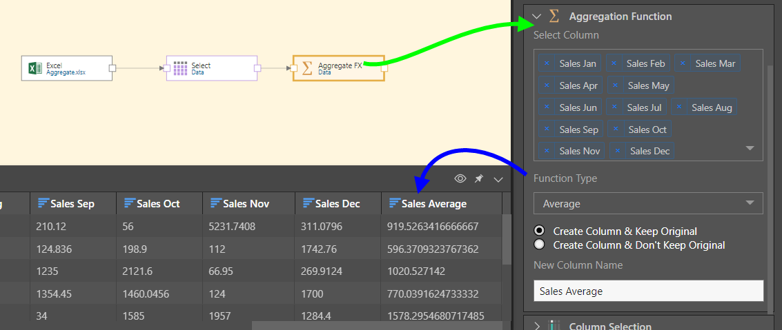 The Aggregation Function node is used create a new column based on an aggregation of multiple given numeric columns. This function supports the following numeric column types: Integer, Float 32, Float 64, and BigInteger.
