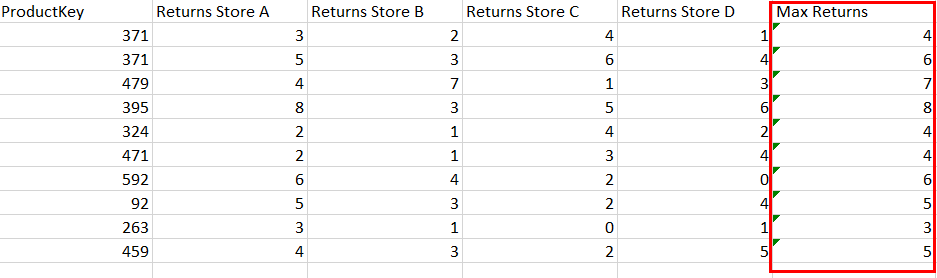 To do this, we aggregate each Returns column by the Maximum function. The new column shows the maximum return value from all given columns for each row: