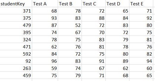 Here we have several columns showing test scores from 5 different tests.
