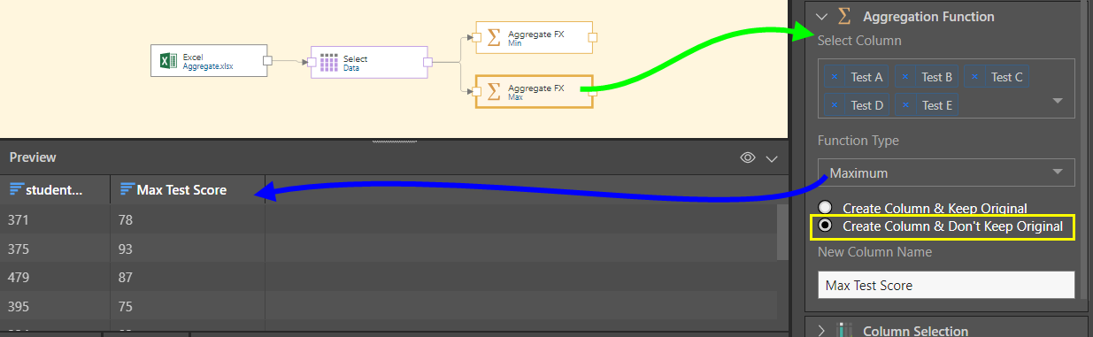 To do this, we'll add a second Aggregation Function node to the original table, this time aggregating the test score columns by the Maximum function, and being sure not to keep the original columns (yellow highlight).
