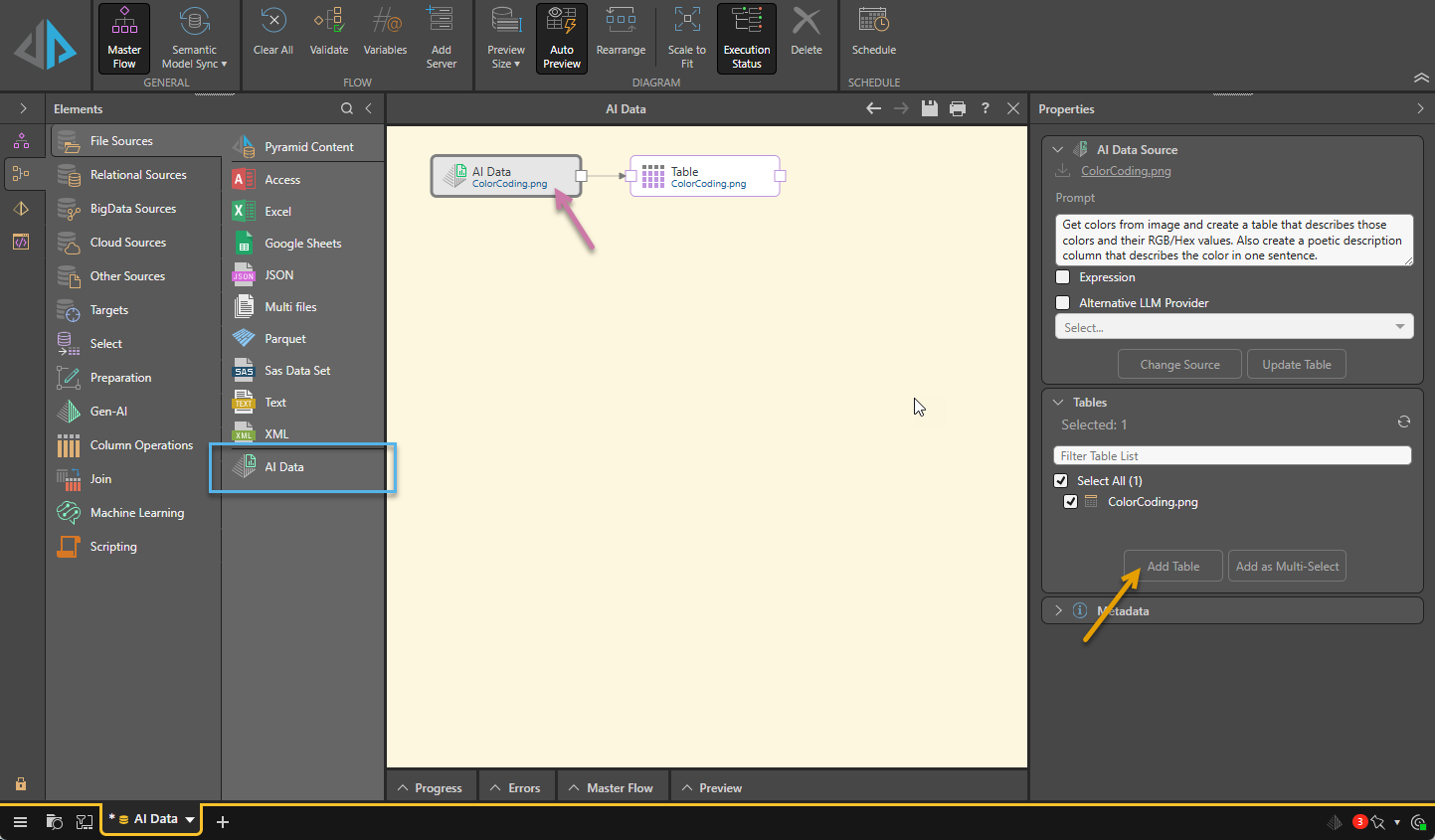 The input ColorCoding.png image is uploaded to the AI Data node on the canvas and a prompt is configured. In this case, the prompt describes some information about the colors in the image that you want to extract for your model. Clicking the Add Table button (orange arrow below) creates the table and connects it to the AI Data node.