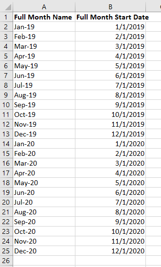 Instead, we sort by the Full Month Start Date Column and end up with a list of months in the correct chronological order: