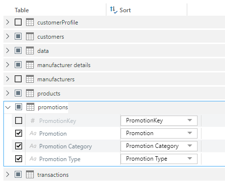 Like the Tables panel, the Columns panel allows you to configure columns by managing their visibility, assigning data categories that will enable certain functionality for end-users, create measures and multi-measures, assign formatting to measures, and sort columns and measures into display folders. Unlike the Tables panel, you can also manage column sorting here.