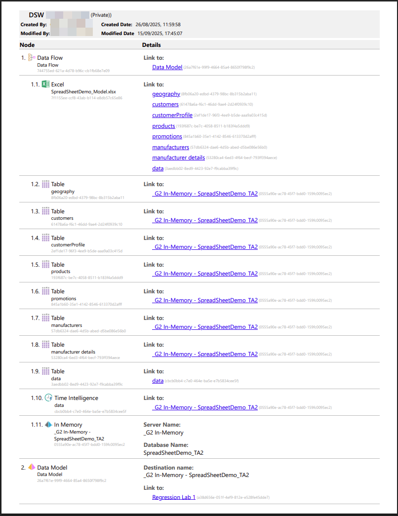 - Functions and other nodes added to the Data Flow. For example, if your tables are sorted, the Sort node will be described in the summary document.