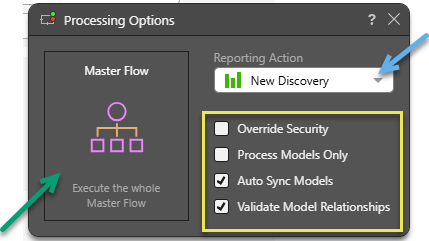 - Reporting Action: (Blue arrow.) Choose which module the new data model should be opened in: Discover, Smart Discover, Smart Publish, or Smart Present. The data model opens in the given reporting tool immediately after processing is complete. If you don't want any reporting tool to open automatically, select None.