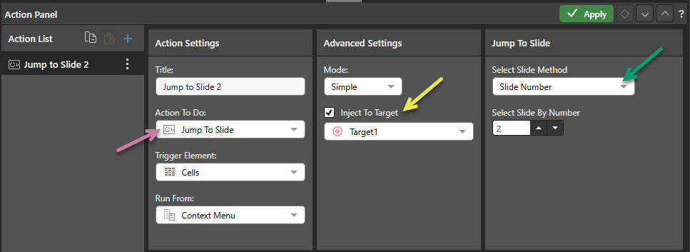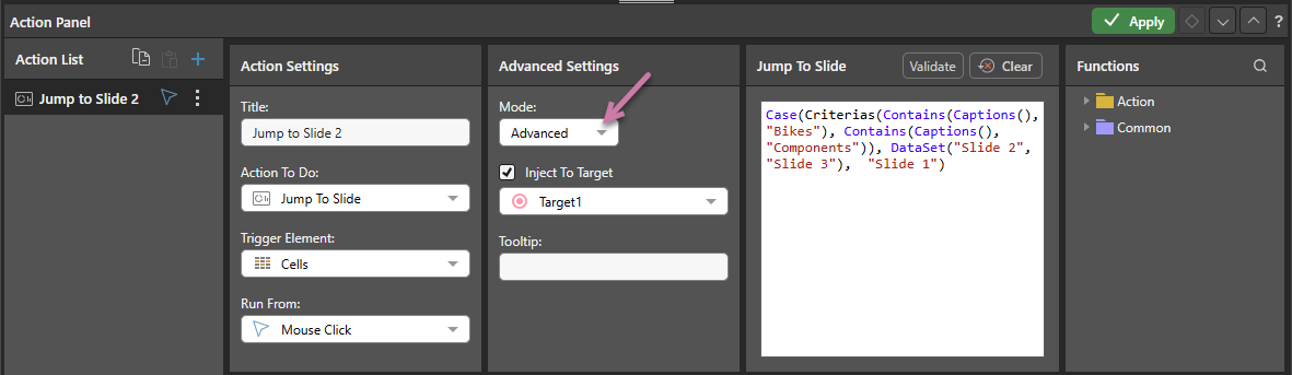 It is possible to configure a Jump to Slide action using the simple method, where you select the slide to jump to when the action is triggered and the advanced method, where you write a PQL expression that selects which slide to jump to based on conditions.