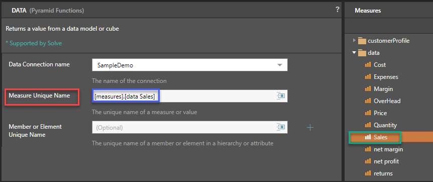 Select Sales (green box) from the drop-down list of Measure Unique Name (red box) for the selected Data Connection. The selected measure name will be displayed (blue box)
