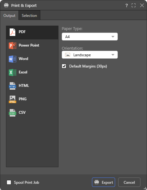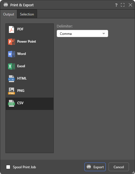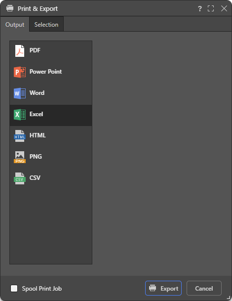 From the Print & Export dialog, select your required Output format. For a tabulation, this can be one of: PDF, Power Point, Word, Excel, HTML, PNG, or CSV.