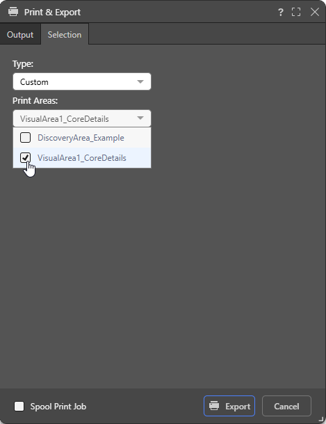 - Custom: Select Custom, and then select one or more custom Print Areas (Visual Areas, Discovery Areas, or Print Areas) from the multi-select drop-down.