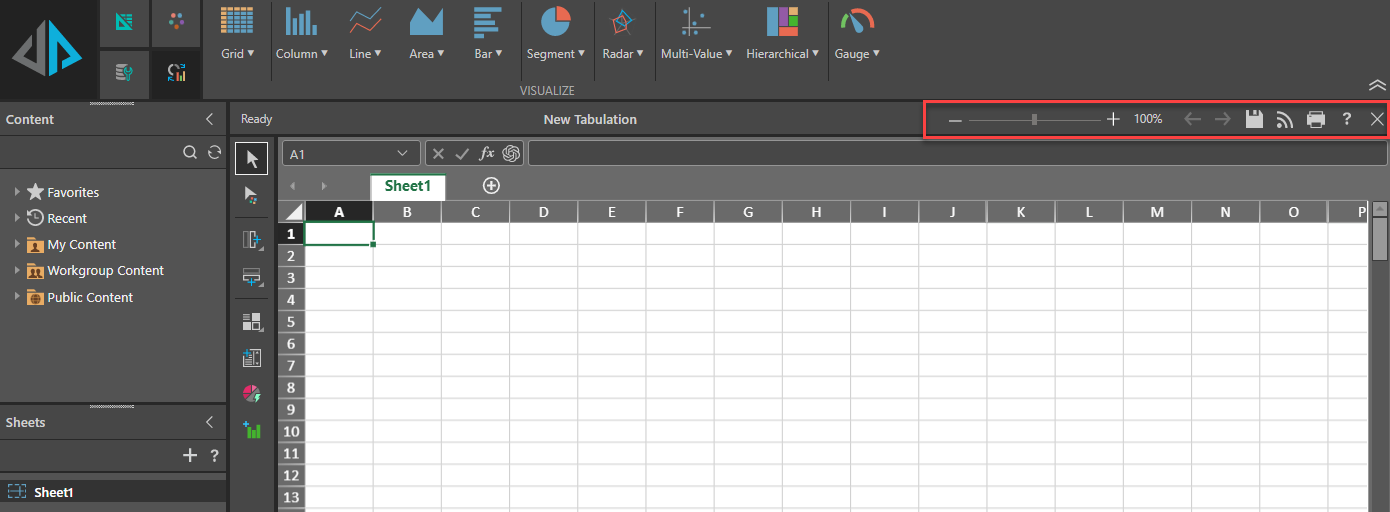 - Zoom (+ slider -): Use the Zoom Slider to either get a more close-up view of your canvas or to see more on the canvas at a reduced size. Note: In Tabulate, the zoom slider only affects the content in the sheet and does not affect your associated visualizations. For more information, see Zoom in or out of a sheet