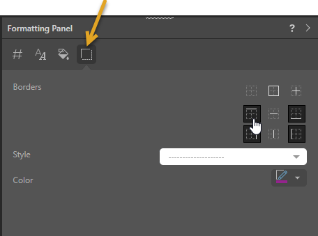 - Borders: Apply borders (left, right, all, and so on) to the selected cell or cells. Tip: You can open the Formatting panel (described above) by selecting Custom Borders from this drop-down.
