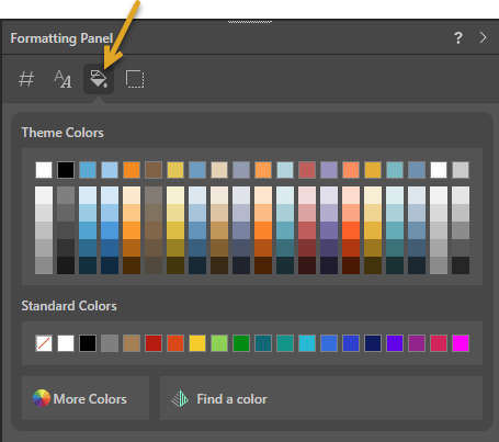 The Fill tab specifies the background color for your selected Tabulate cell or cells. Select the cells that you want to format, right-click Format Cells and pick the Fill tab in the Formatting panel.
