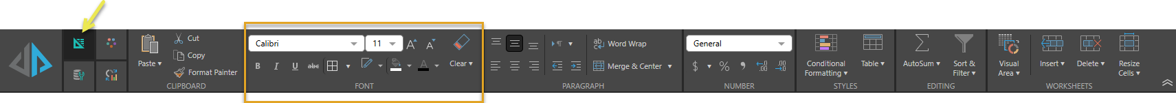 The Font settings (orange box, above) enable you to specify the appearance of text within your spreadsheet's cells. Select the cell or cells whose content you want to format and pick the option you want from the ribbon. This sets the font to use, the size and color of your text, and so on.