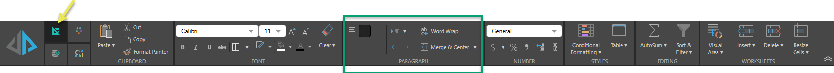 The Paragraph settings (green box, above) enable you to arrange text within the selected cell or cells. Select the cell or cells whose layout you want to affect and pick the option you want from the ribbon. This sets the alignment, wrapping, merge option, and so on: