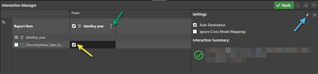 When designing your tabulation, you can use the Interaction Manager to indicate which slicers should affect which discovery areas. The Interaction Manager opens at the bottom of your canvas. You can use it, for example, to link a Year slicer to Sales data from a discovery area by selecting the checkbox between them. This action specifies which data should be filtered by the selected slicer.