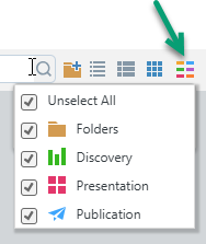 This button lets the user filter the types of items in a given view that will be shown in the list. For example, if you clear the Unselect All checkbox and then select the Discovery checkbox, only discoveries are shown.