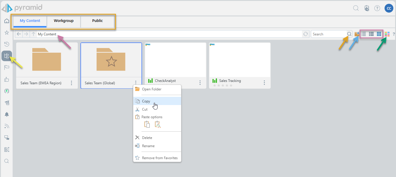 Note: There are additional options on the context menu if your content item or folder is saved to the My Content location, even if you are in one of the other views.