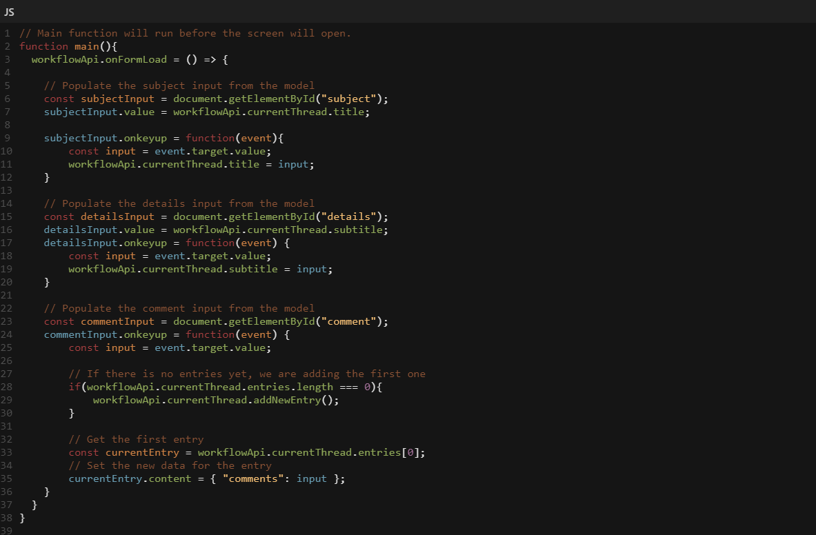 The "OnFormLoad" event triggers after the screen is loaded, so we can integrate it our HTML elements. Here we are using the API object, "workflowApi," to retrieve the thread's data, and set it in the HTML form input elements.