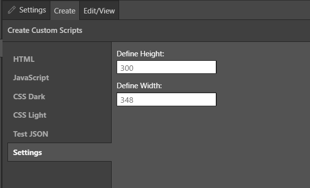 Lets next go to the "Settings" tab. Here we can manage the settings of the screen. In our example we going to set the height to be 300px.