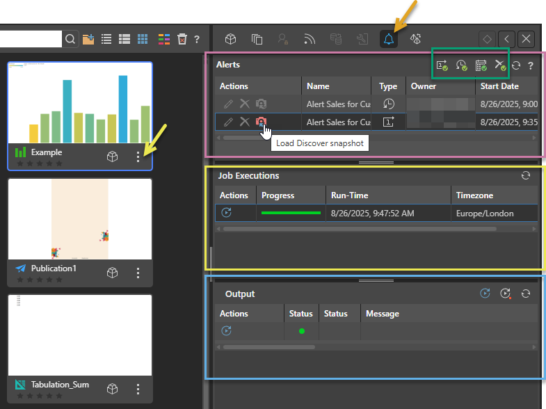 From the Alerts panel, you can edit or delete an alert schedule or open a specific execution of a previous alert run to view its results.