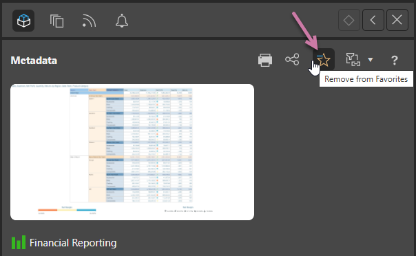 There is also a Favorites button in the Metadata Quick Functions (purple arrow) in the Actions Panel. This panel is opened either by clicking Actions on the context menu, or by clicking the Metadata button (yellow arrow in main view). Again, this is a toggle which, if flagged, switches between adding and removing the item as a favorite: