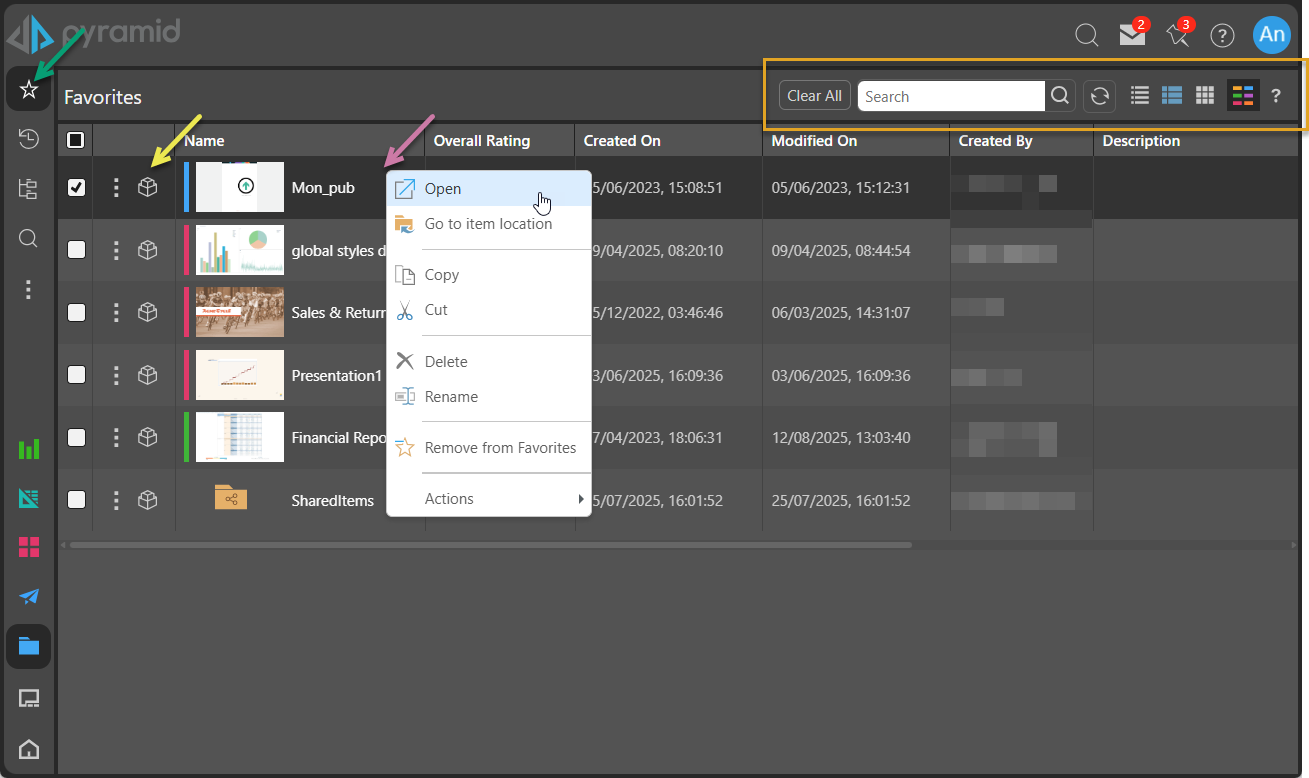 By default, Favorites is the first view users see when accessing the Content Manager, provided they have marked items or folders as favorites. Favorites typically appears at the top of the CMS toolbox (indicated by a green arrow in the main view) and can be configured as the Default Content View for Pros or Admins opening the CMS.