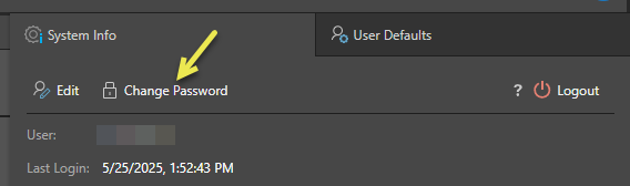 - Click Change Password (yellow arrow above) to open the Change Password pop-up, where you can supply a new password for logging in to Pyramid.
