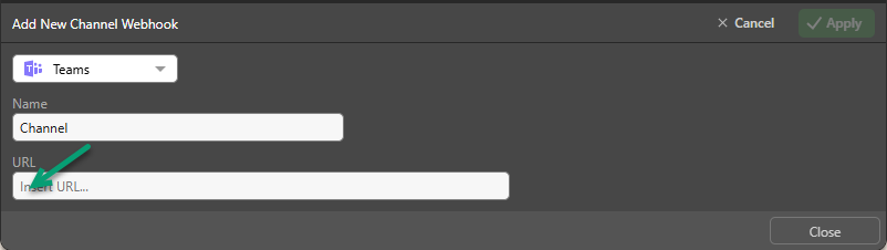 Go to Pyramid. Paste the Webhook URL into the URL field under Add New Channel Webhook (green arrow below). Once you are ready, click Apply to create the Webhook.