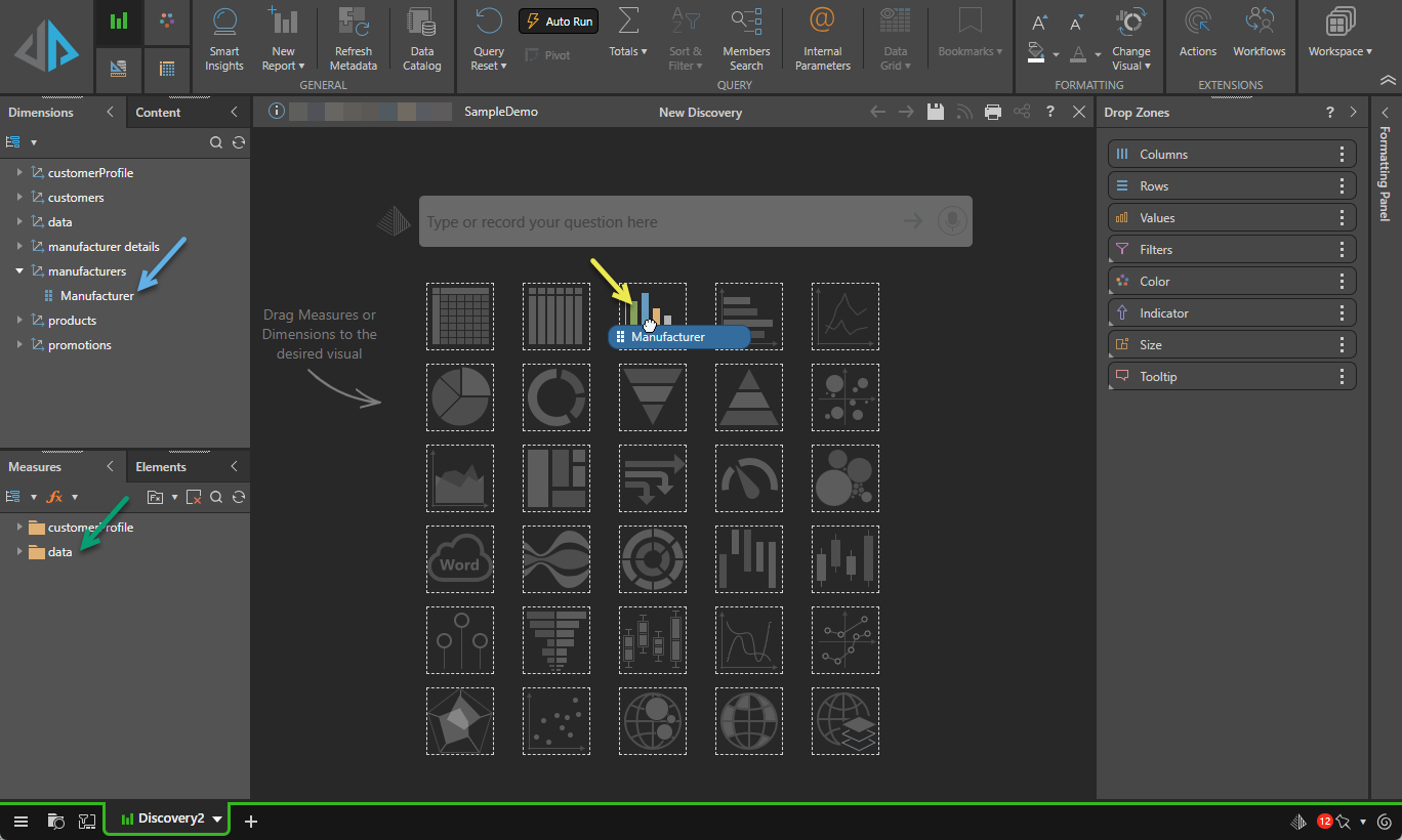 • You can build your visualization by dragging and dropping your hierarchies from the Dimensions panel (blue arrow above) onto the canvas (yellow arrow), and then adding other Hierarchies and Measures (green arrow) as needed. For more information and alternatives, see Building Visualizations in Discover Pro.