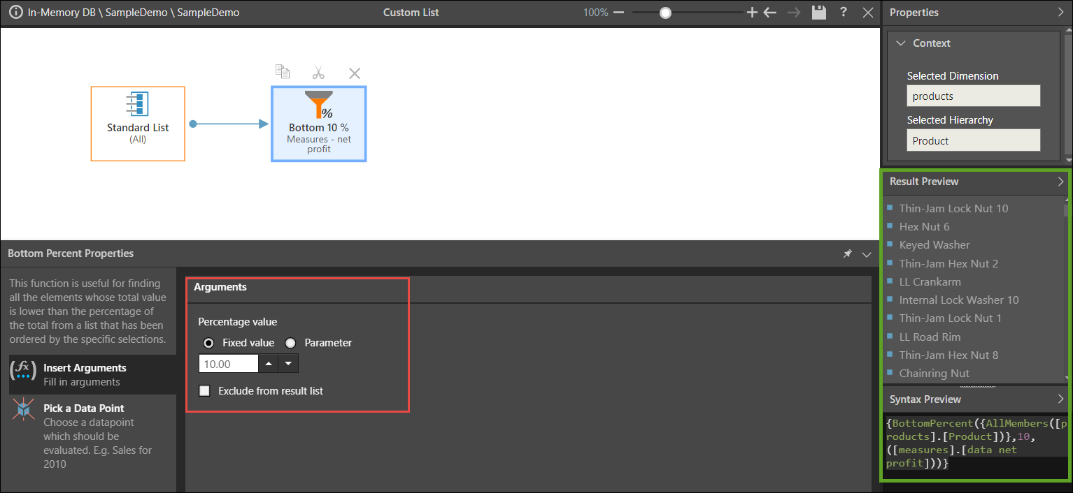 This expression returns a list of the bottom 10% of Products by Net Profit; the given list is the Products hierarchy, and the Bottom Percent block is assigned a set value of 10 percent and Net Profit as the data point: