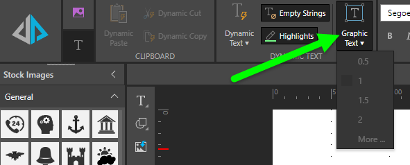 To add graphic text, right click on the textbox icon in the canvas menu, and select the graphic text icon.