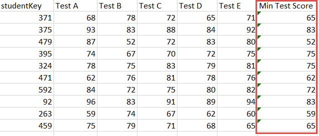 We'll start by aggregating all the test score columns by the Minimum function, to add the new Min Test Score column to the table: