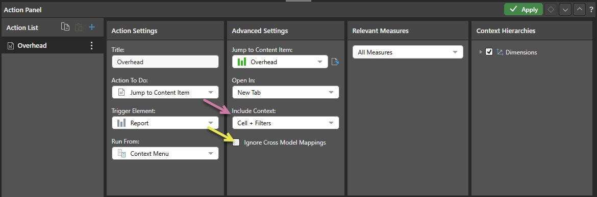 When the selected action type is Jump to Content Item, any interactions at runtime are applied to the content item opened by the action. By default, Pyramid recognizes any cross-model mappings that have been configured between items with interactions, but you can select Ignore Cross-Model mappings on the Actions Settings tab to ignore any cross-model mappings and instead produce an error.