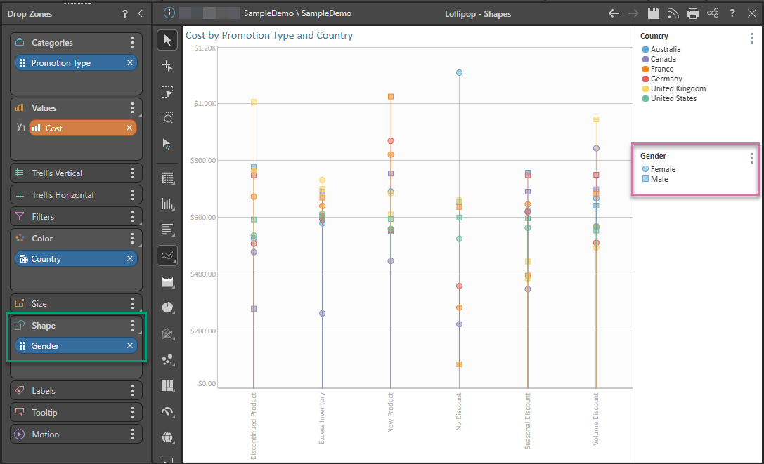 In this example, the Lollipop Chart displays Cost by Promotion Type, with Country in Color:
