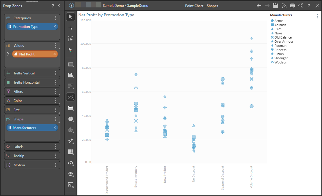 The following Point Chart shows Net Profit by Promotion Type where Manufacturers is added to the Shape drop zone: