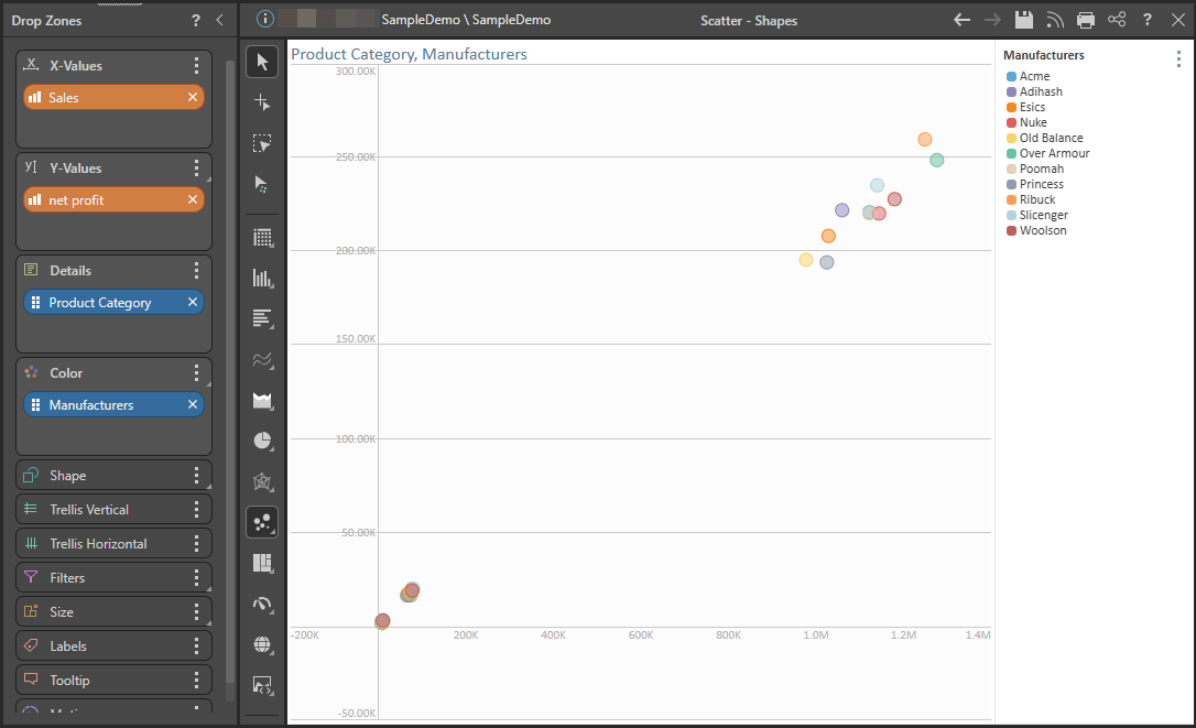 In this example, the Scatter Chart displays Sales and Net Profit for Manufacturers, with Product Category in Details: