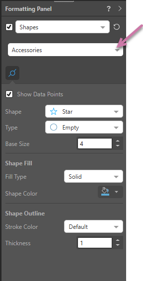 To adjust the formatting for shapes and data points, open the Formatting panel and choose Shapes from the dropdown list. Alternatively, enable the formatting selector and select a data point on the visual.