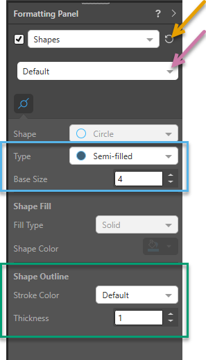When a particular value is selected from the dropdown list (purple arrow below) all shape options are enabled. Changing the option changes the formatting for the selected shape, overriding the default.