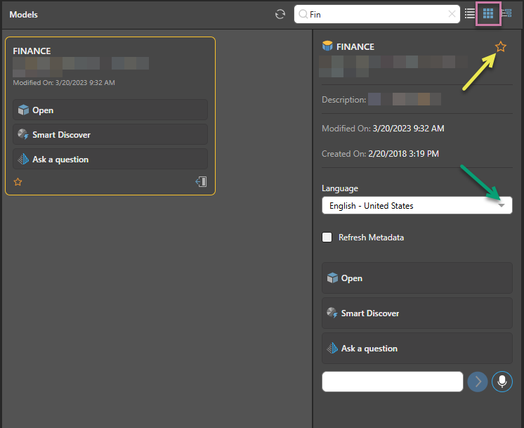 • Open the selected model in Discover Pro, Smart Discover, or the NLQ (Ask a question).
