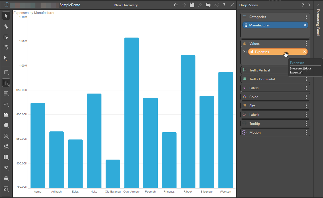 It is important to note that Pyramid's data visualization engine offers users a huge range of core visualizations, as well as the ability to create custom visuals. Each core visualization can be tweaked by adjusting the chips in the drop zones. Pyramid also offers tremendous flexibility when it comes to formatting, which can be leveraged to significantly change the look and feel of each visualization.