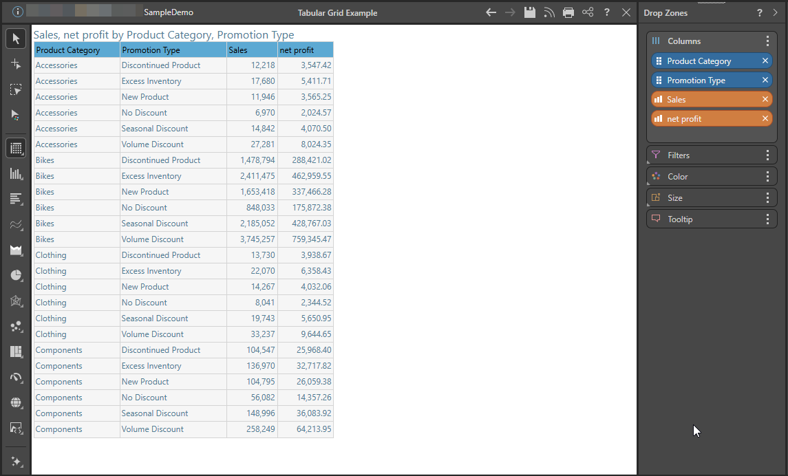 Matrix grids display hierarchies and measures as columns and rows, and are highly customizable. Tabular grids display hierarchies and measures and columns; they are similar in appearance to raw data grids, but like matrix grids they can be customized and formatted.