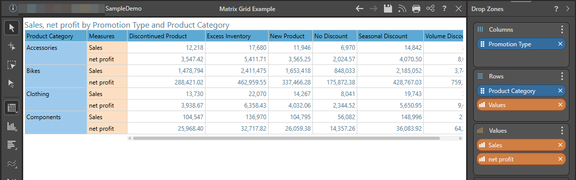 In the preceding example, the Promotion Type hierarchy is added to the Columns drop zone and Promotion Type to Rows. Each member element within the Promotion Type hierarchy is displayed as a column in the grid, while each element under Product Category is displayed as a row.