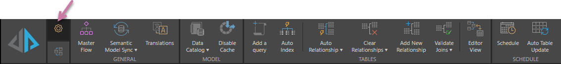 - Semantic Model Sync: Click this button to sync the Model. The sub-menu controls the automatic syncing behavior.