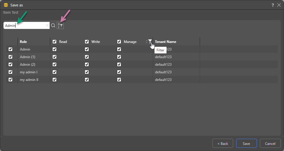 Tip: Given that there can be many roles, you can use Search (green arrow below) to find roles by name, use the name filter to filter them by their starting letter (purple arrow), or manage the list using the sort and filter options on the columns (shown on hover).